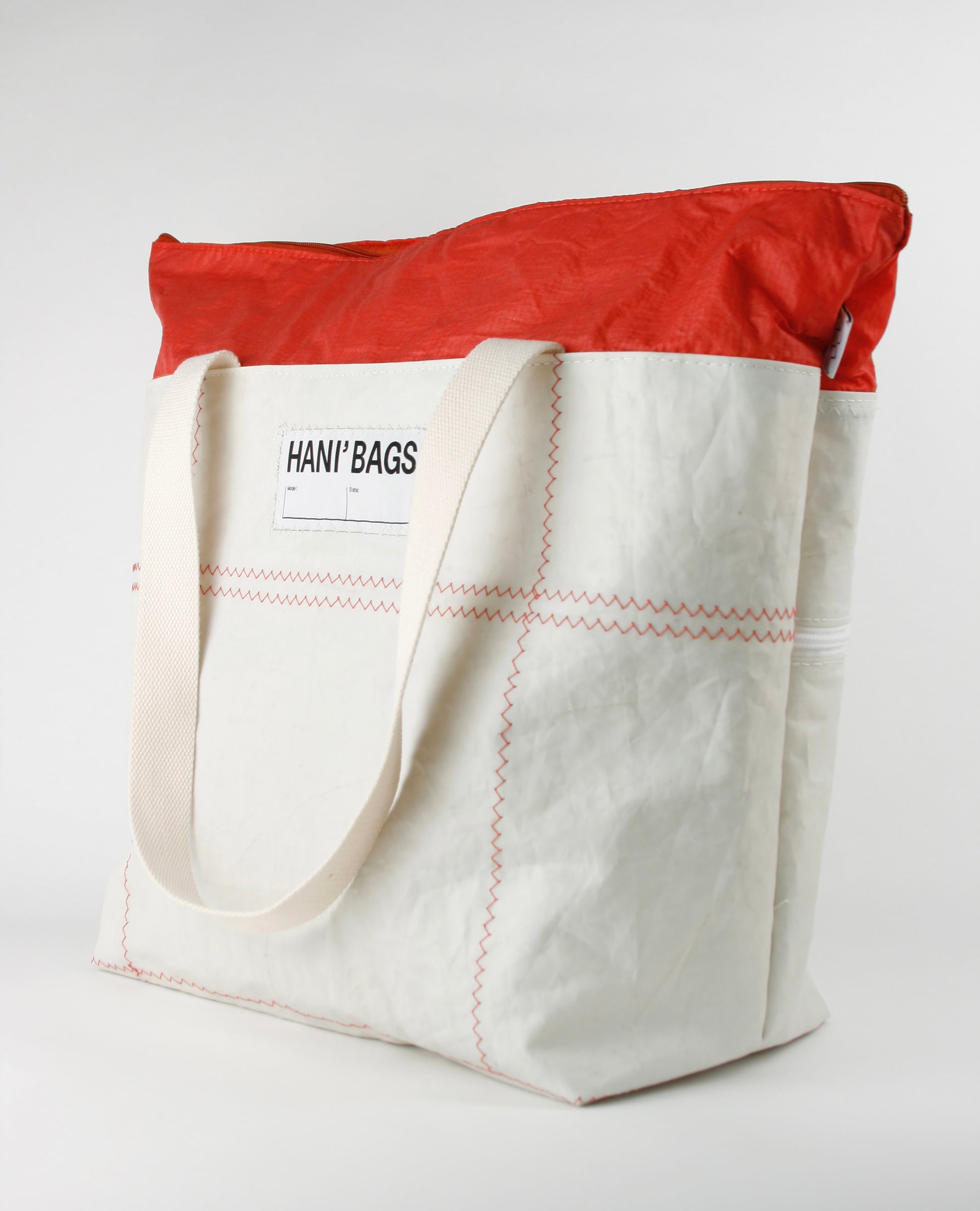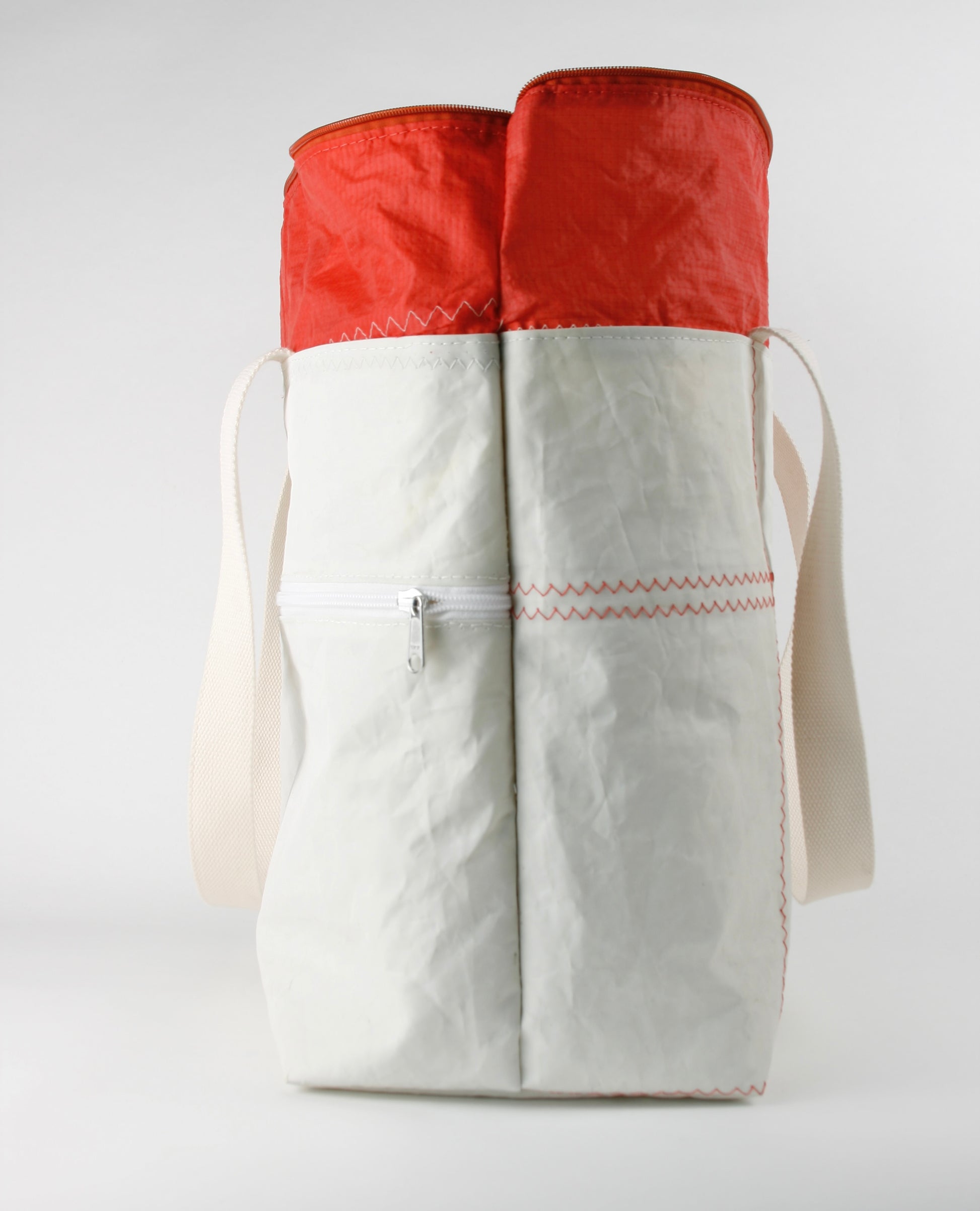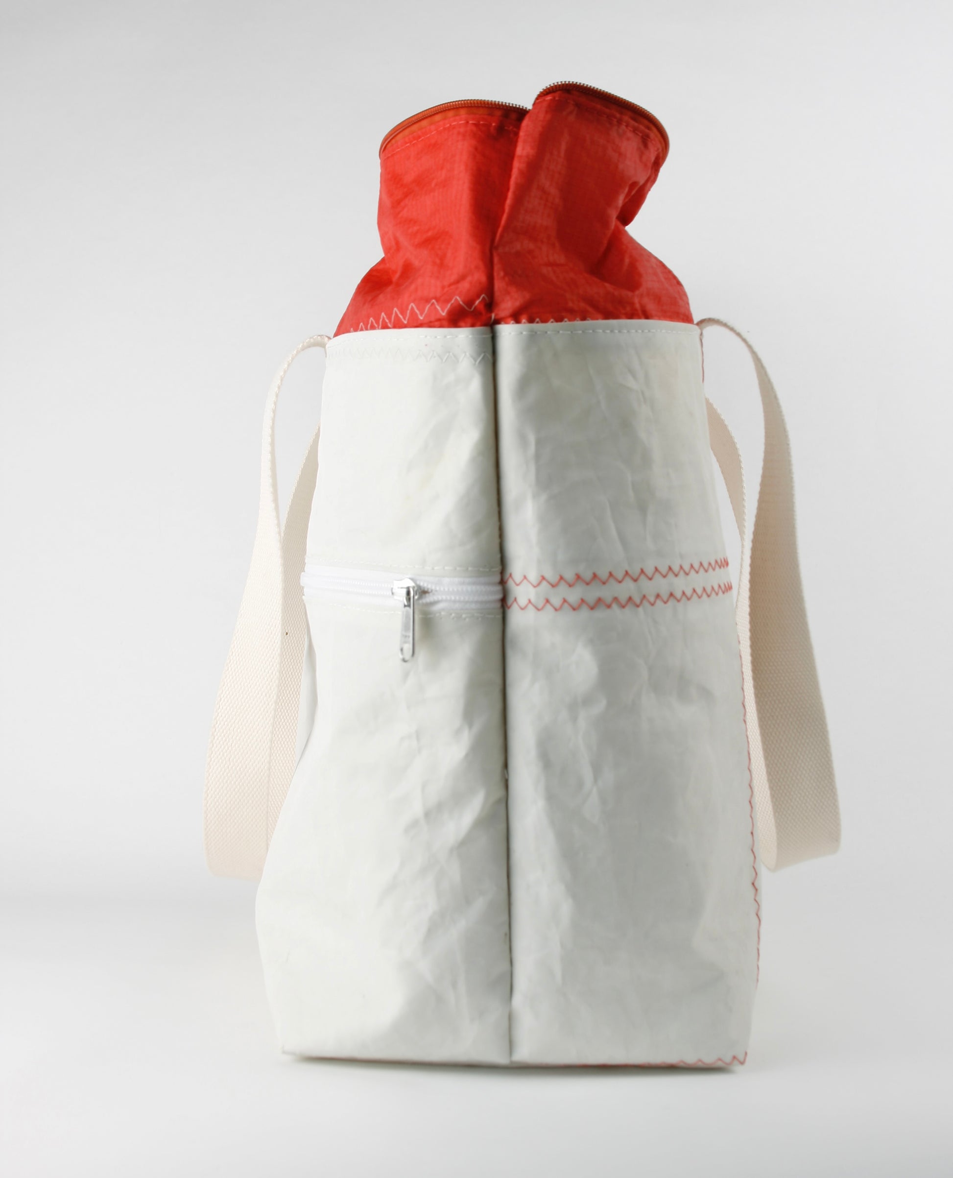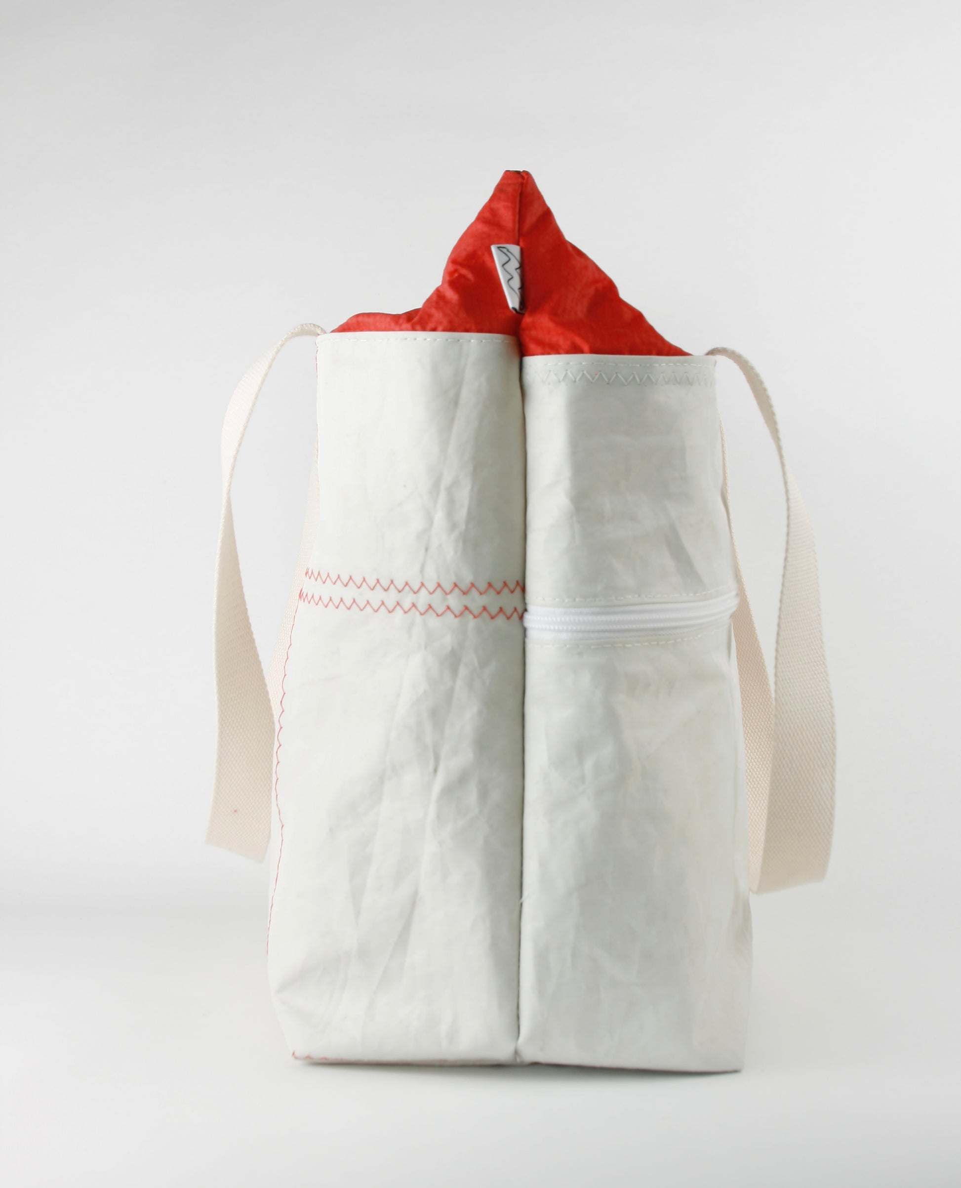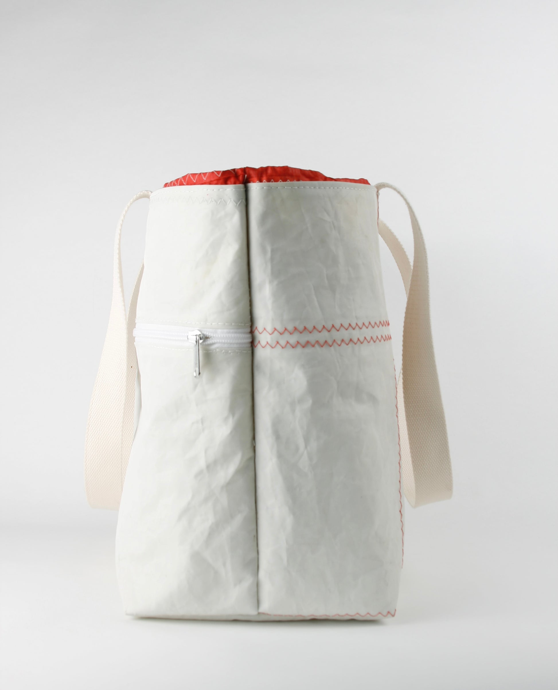 CINDY 015 is characterized by the combination of strong sailcloth for the main body and fine bright red spinnaker sailcloth as the closing top. The strong fabric forms the rigid, stiff structure, enabling the bag to stand by itself, as the light layer closes it up with an elegant and fine appearance.