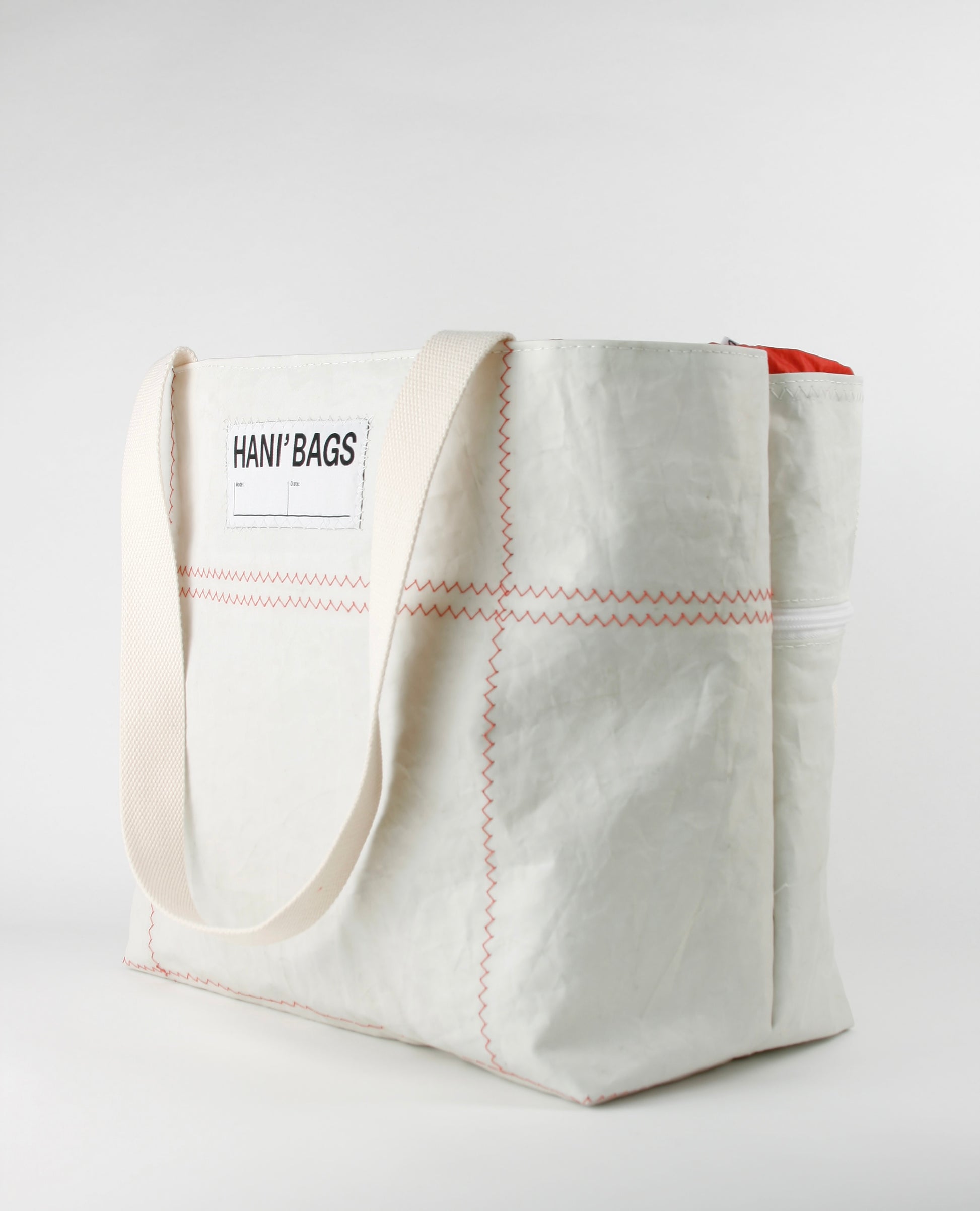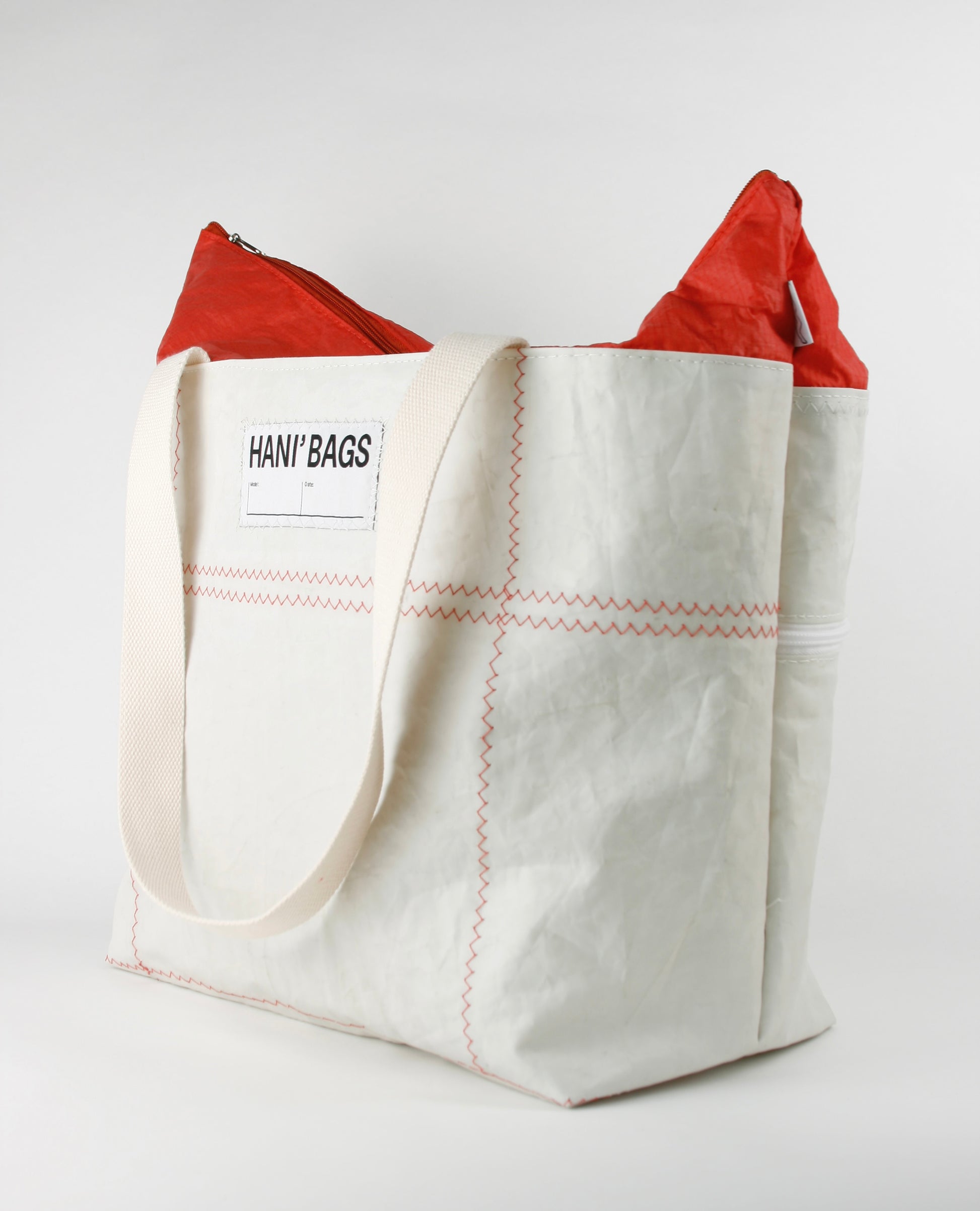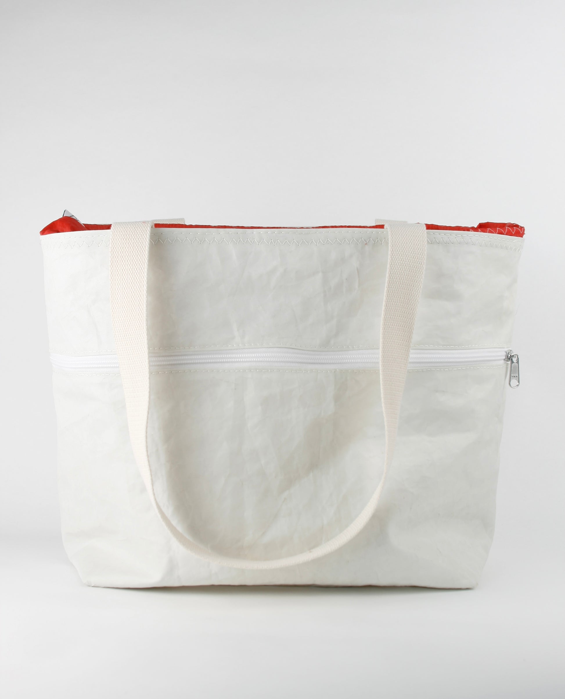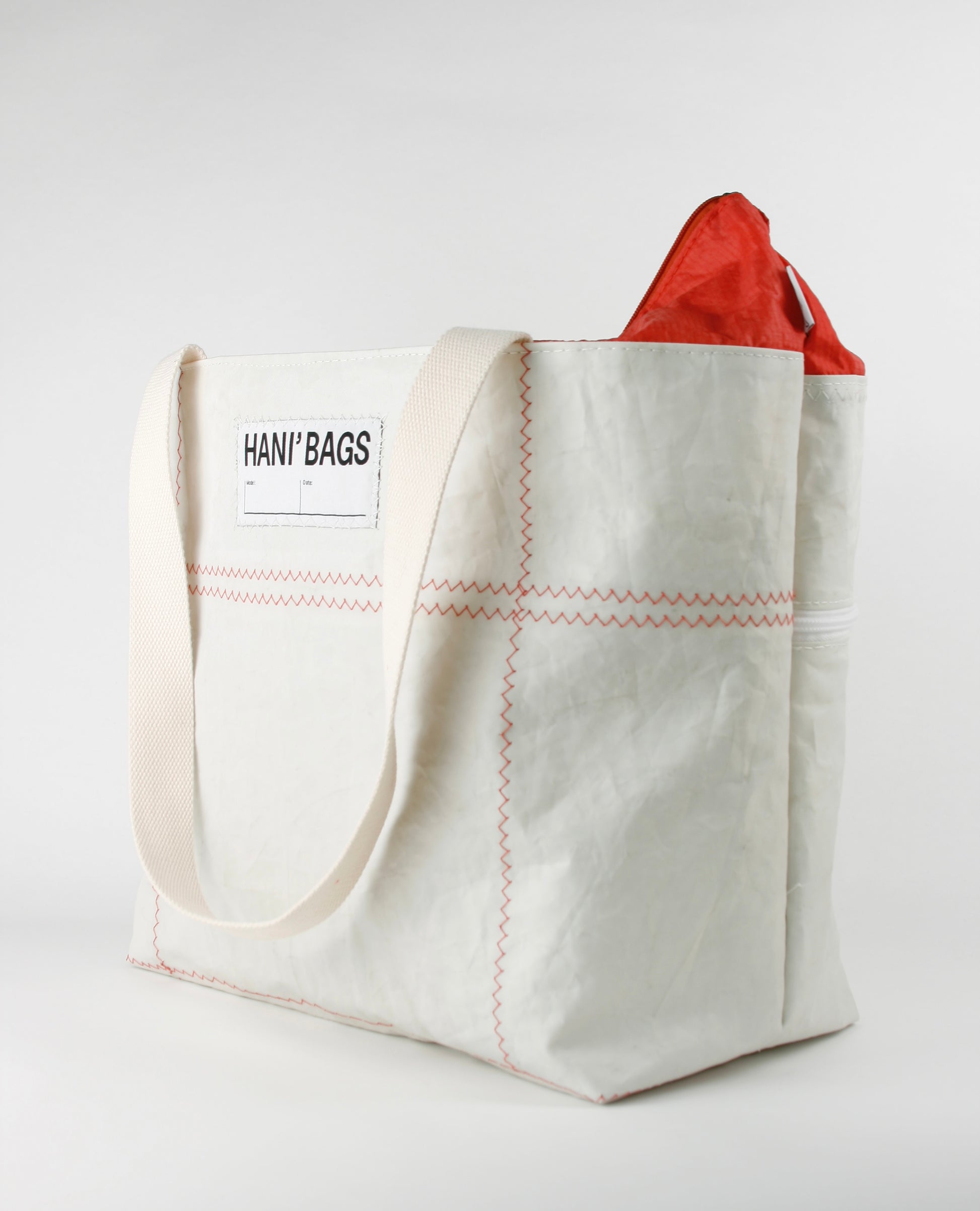 CINDY 015 is characterized by the combination of strong sailcloth for the main body and fine bright red spinnaker sailcloth as the closing top. The strong fabric forms the rigid, stiff structure, enabling the bag to stand by itself, as the light layer closes it up with an elegant and fine appearance.