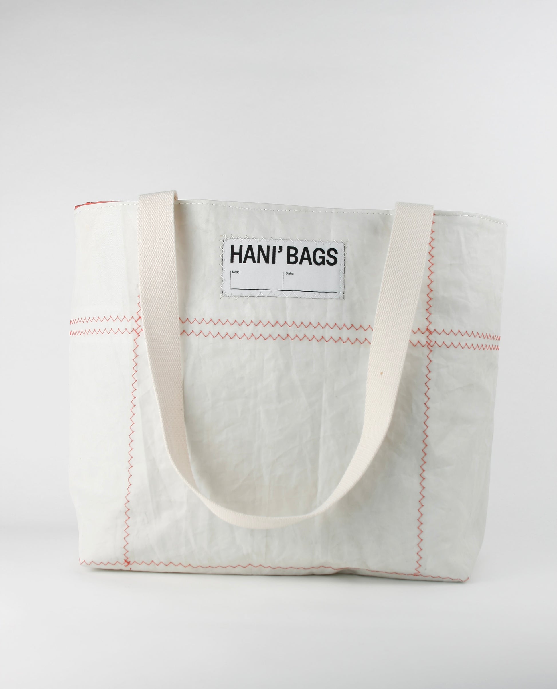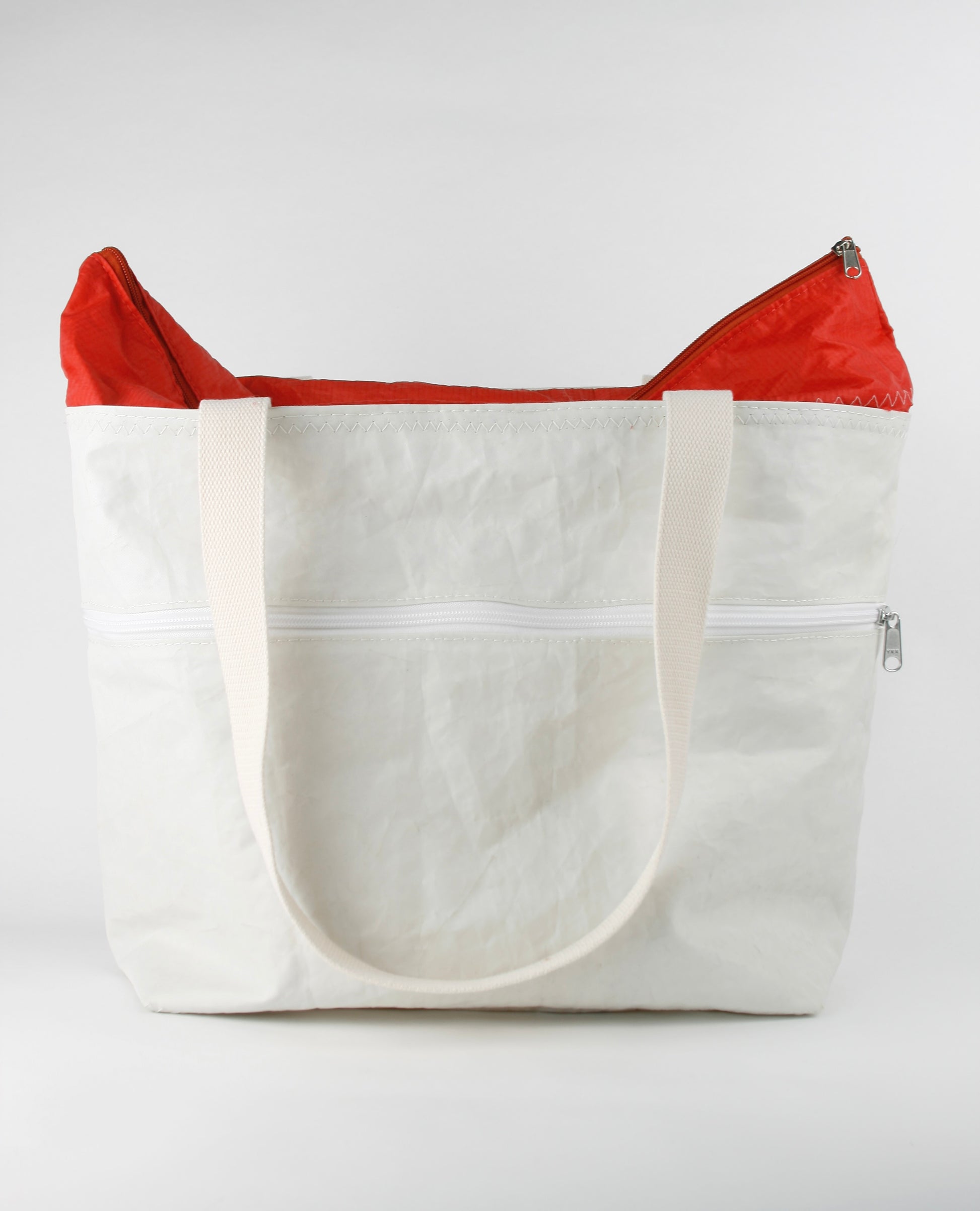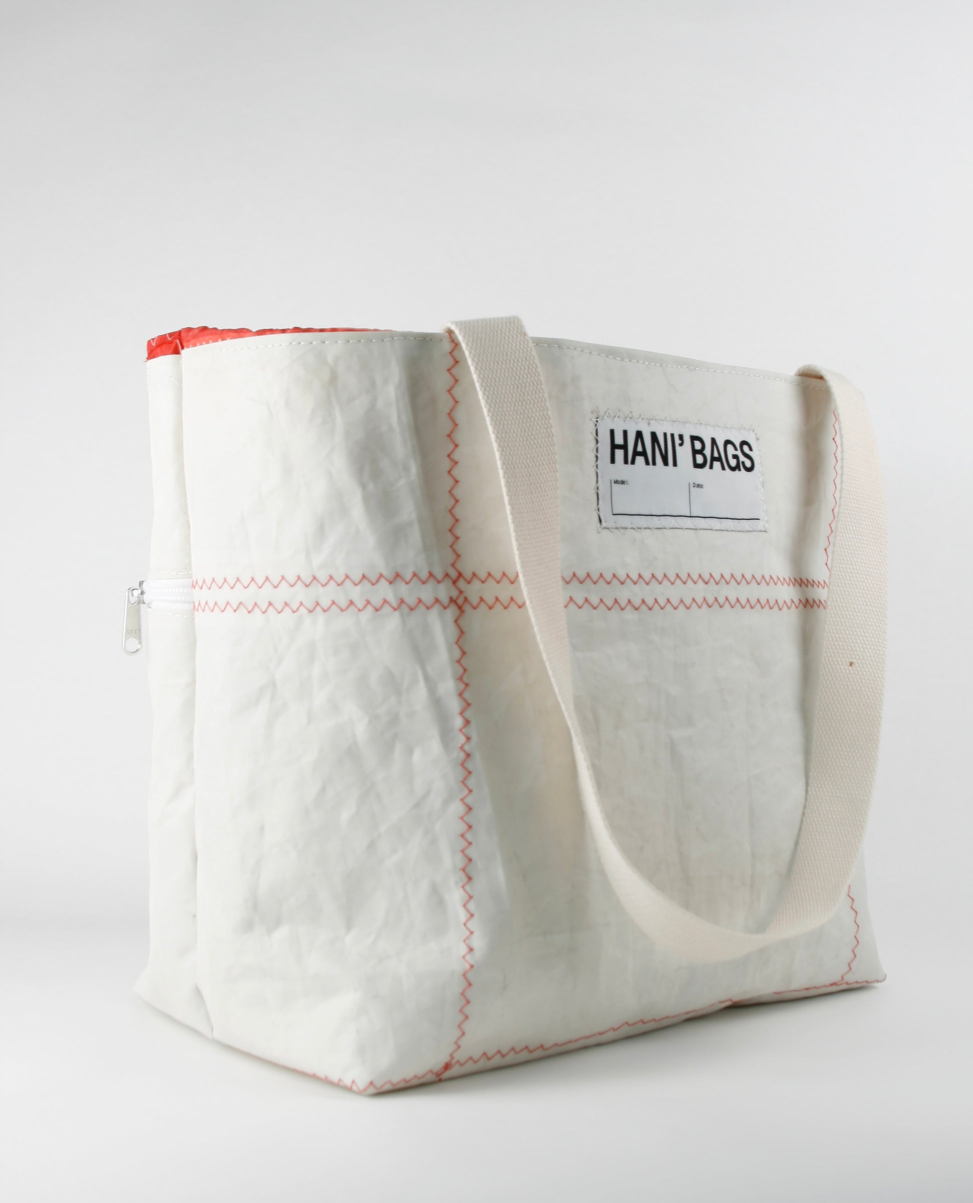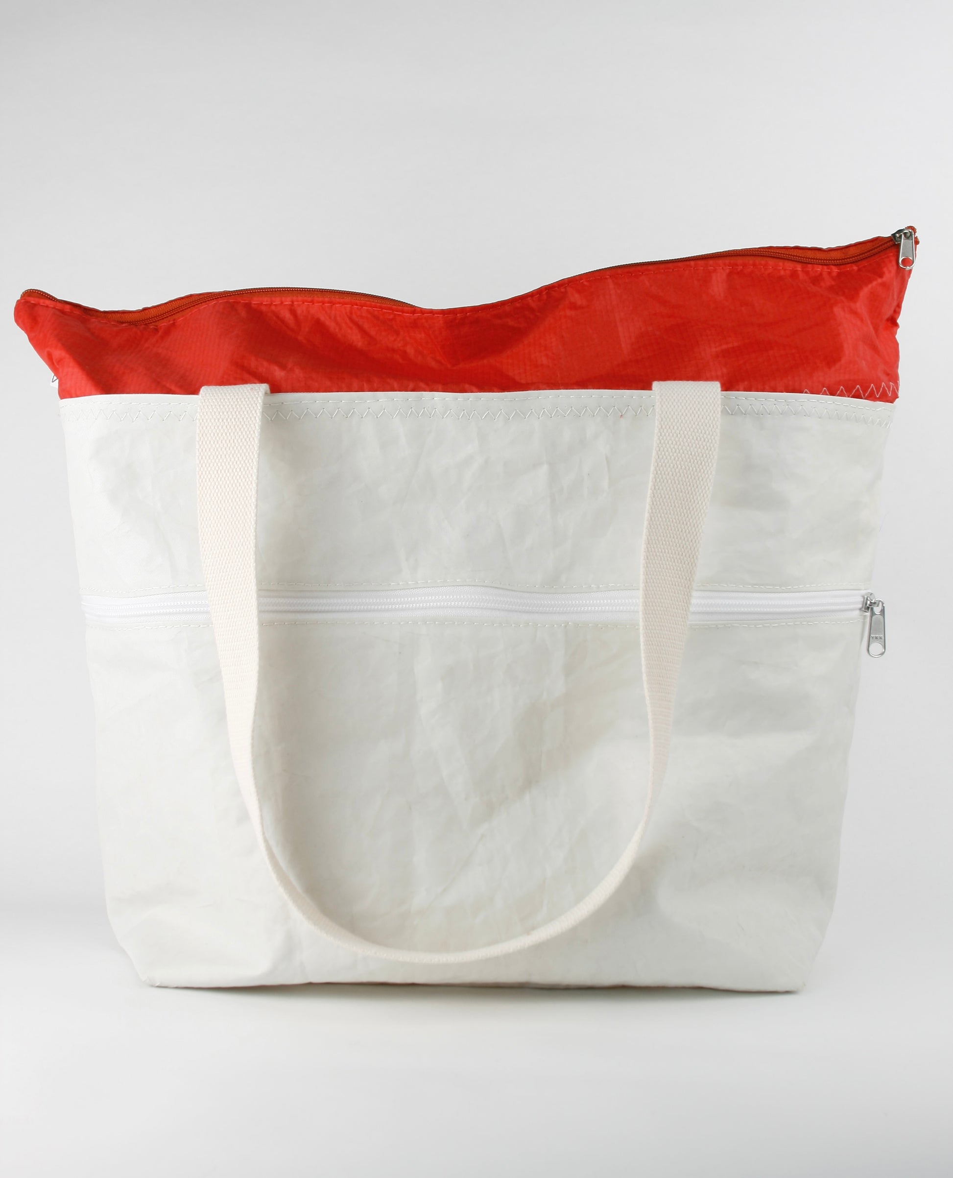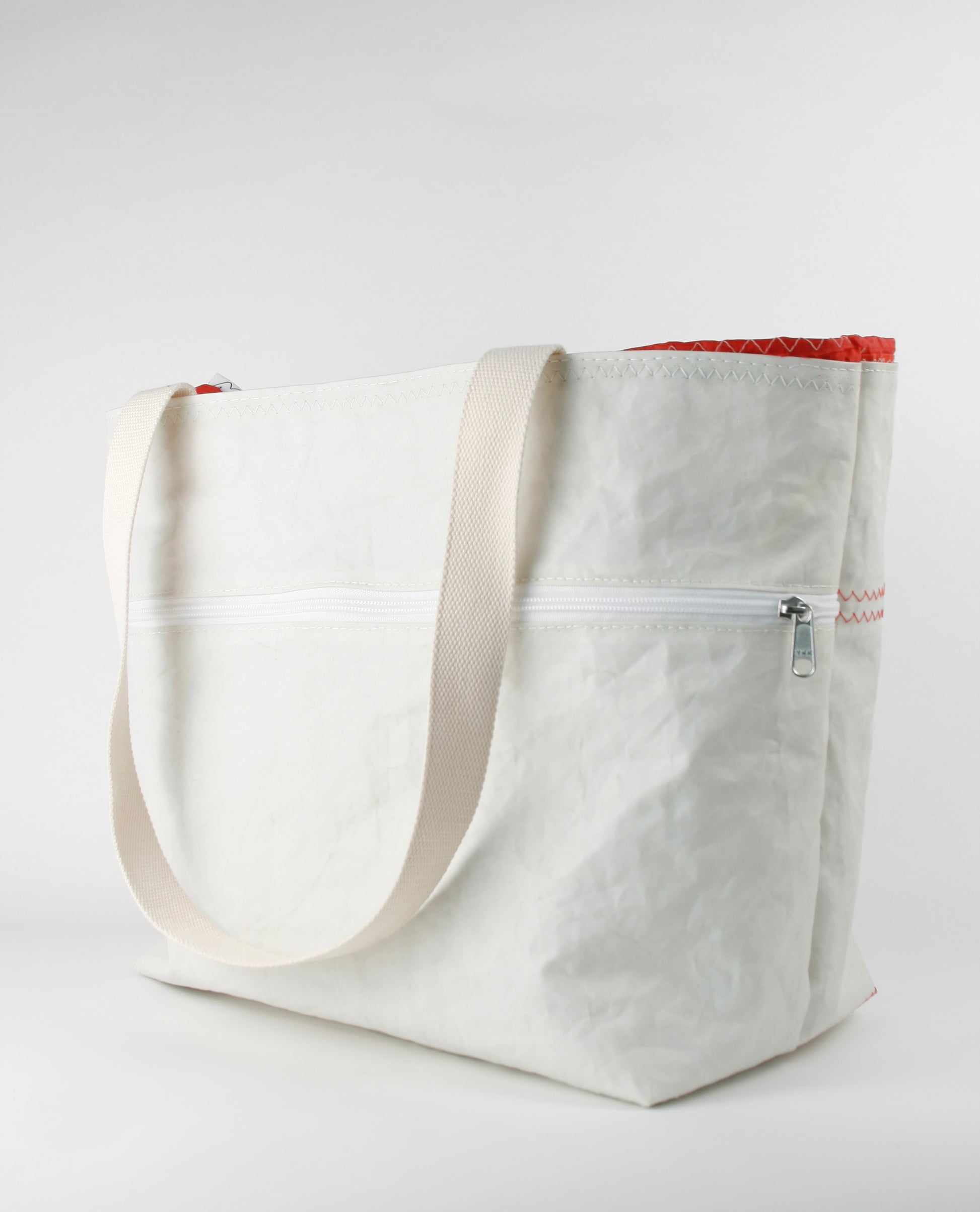 CINDY 015 is characterized by the combination of strong sailcloth for the main body and fine bright red spinnaker sailcloth as the closing top. The strong fabric forms the rigid, stiff structure, enabling the bag to stand by itself, as the light layer closes it up with an elegant and fine appearance.