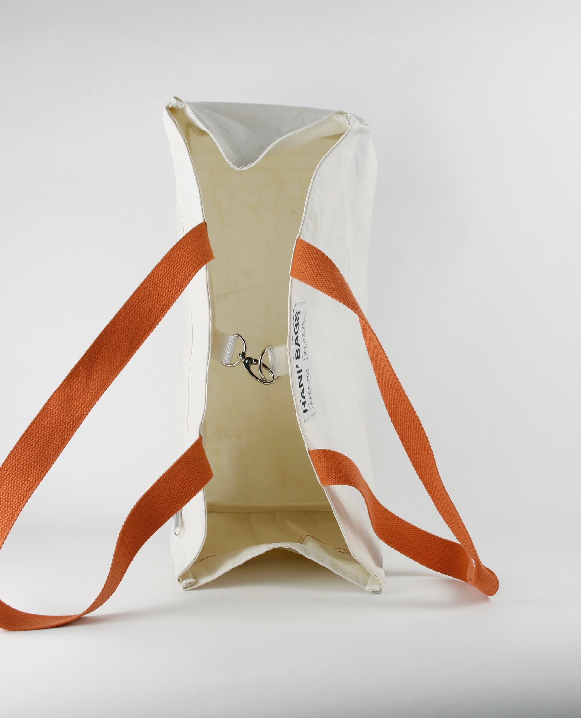 Material : 100 % recycled sailcloth material; polyester- / nylon fibers (fabric), polyester/cotton (straps), metall (hardware)